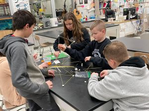 Ms. Friot explained that during this event in January, coaches provided a verbal and hands-on problem to solve. “Each coach brought enough supplies for six teams to rotate through their rooms. A strict time limit of seven minutes for the hands-on problem and three minutes for the verbal problem was set. Points were awarded for solutions, but extra points were given for originality and teamwork,”Ms. Friot said. The students ended the Spontaneous Overload evening by celebrating their success while enjoying pizza with their teammates.